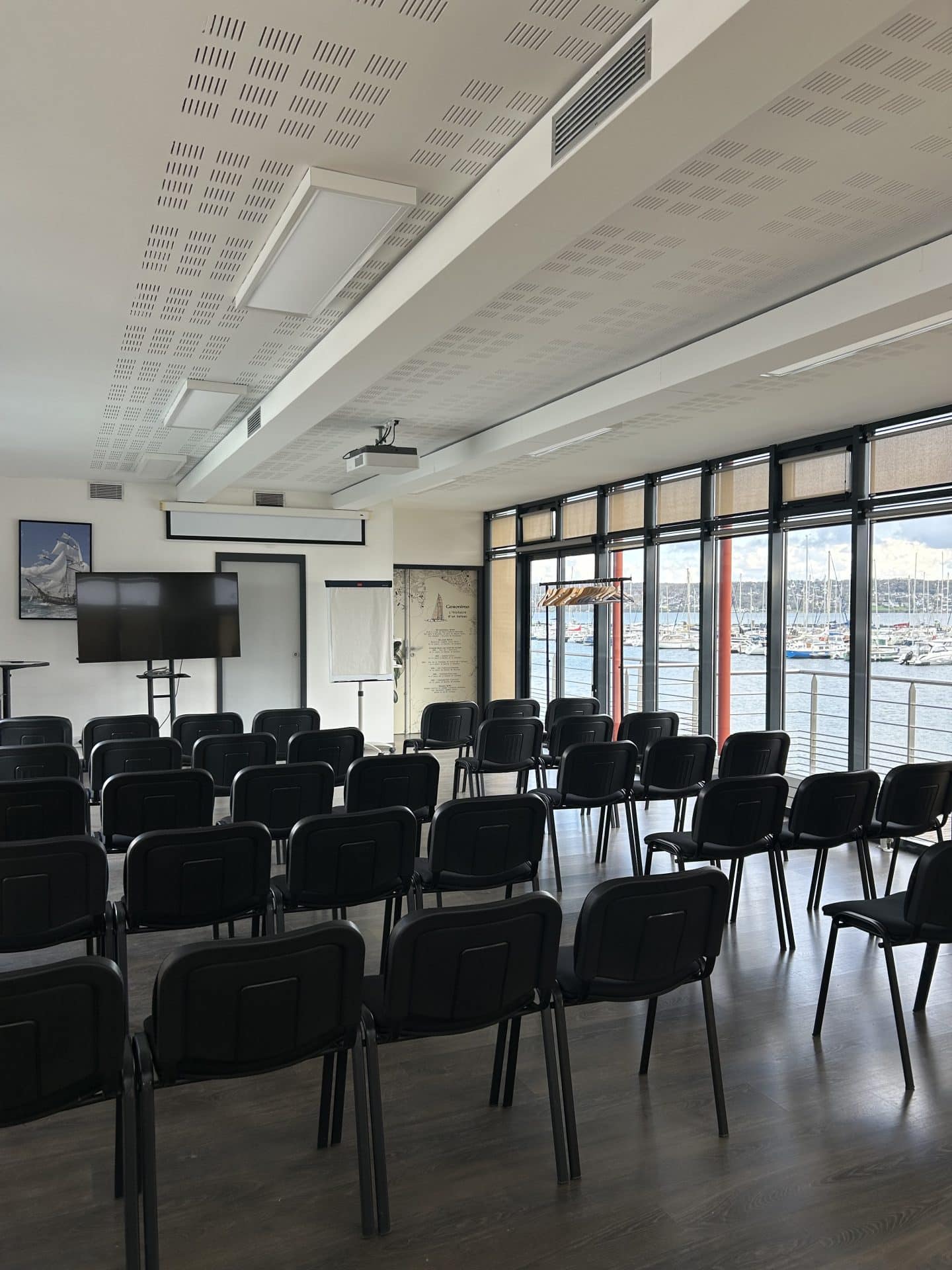 De l’étage de la capitainerie, le panorama sur le premier port de plaisance de Bretagne est superbe, avec en fond la mer d’Iroise. Dépaysement et air iodé garantis pour vos réunions !